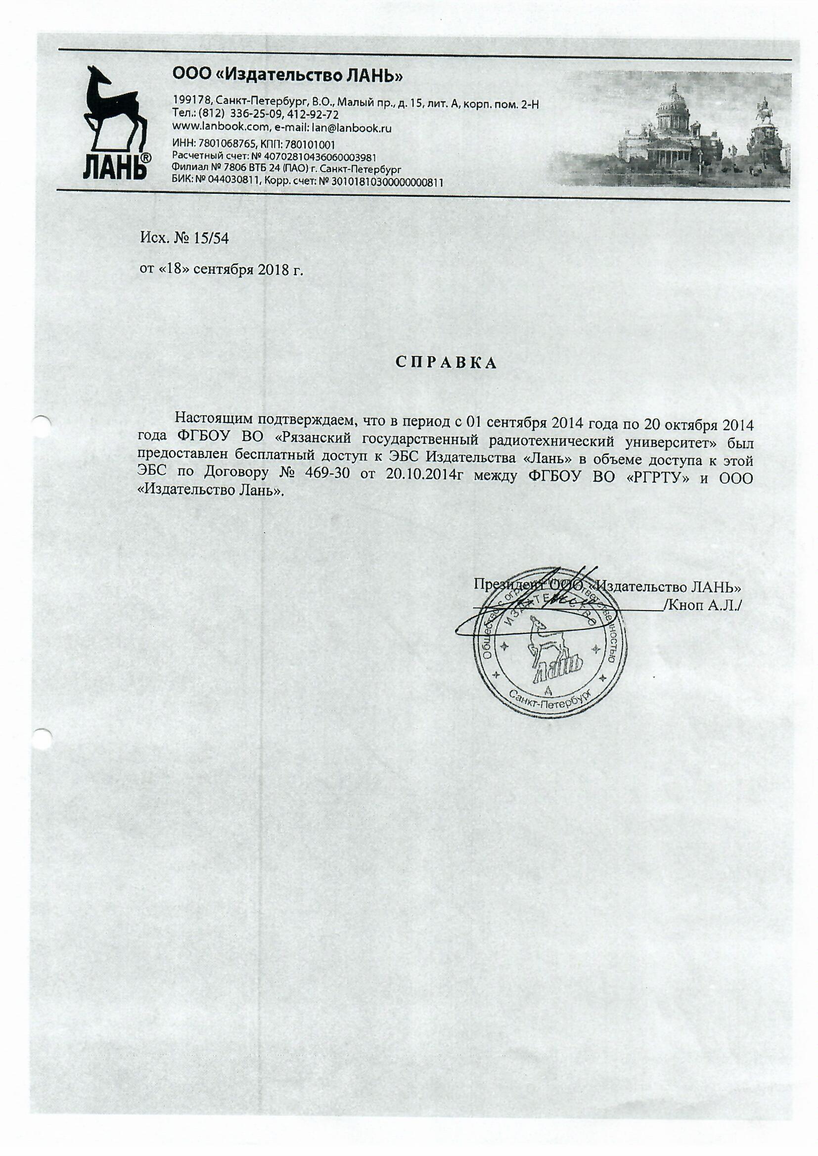 Справка №15/54 от 18.09.2018 г. о доступе к ЭБС "Лань"